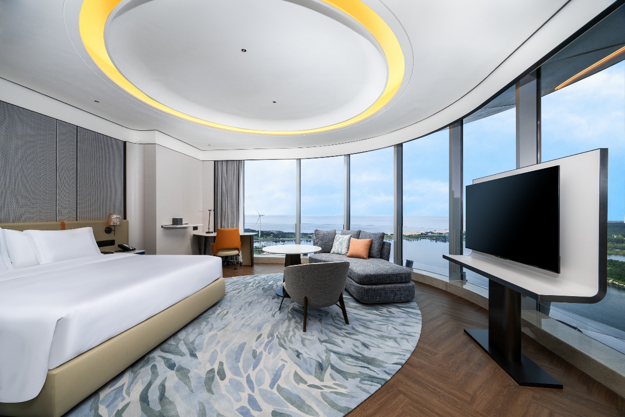 酒店拥有328间摩登雅致的客房及套房,酒店部分客房可看到海景欣赏最美日落,部分客房更设有270度全景落地窗,让宾客专注高效地投入工作之余,拥有一段悠闲放松的时光。